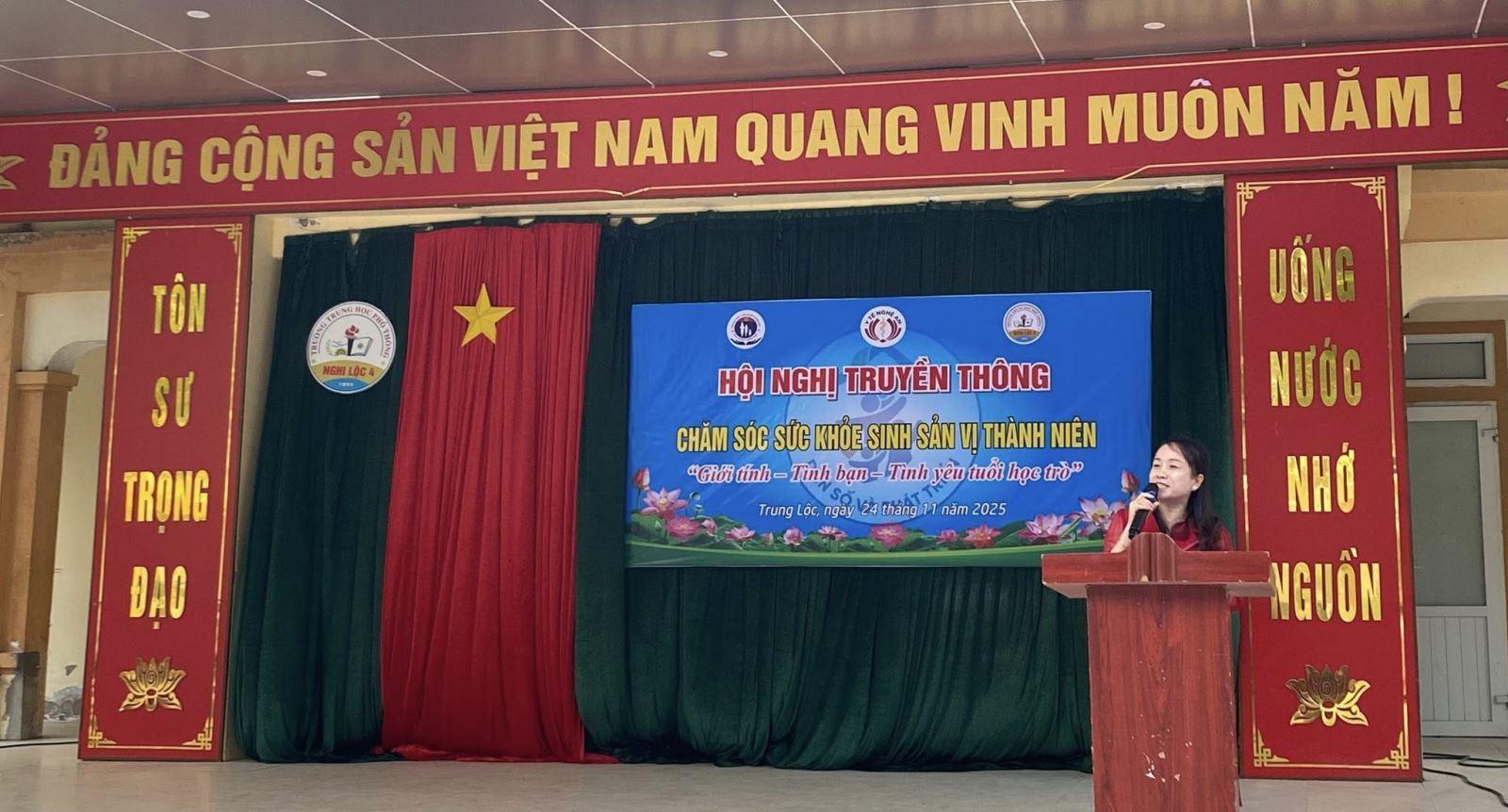 Thực hiện nhiệm vụ năm học 2025–2026, chiều ngày 24/11, Trường THPT Nghi Lộc 4 phối hợp với Sở Y tế Nghệ An và Trung tâm Y tế Nghi Lộc tổ chức buổi truyền thông giáo dục sức khỏe dành cho học sinh với chủ đề: Truyền thông về chăm sóc sức khỏe sinh sản vị thành niên “Giới tính – Tình bạn – Tình yêu tuổi học trò”